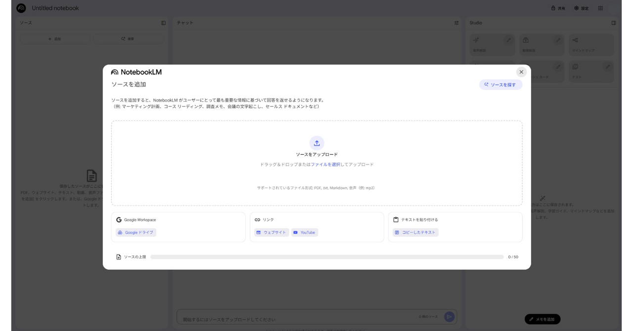 そのため、議事録作成時には、録音した音声データをアップロードするか、外部の文字起こしツールでテキスト化した内容をNotebookLMに取り込むことが前提となります。