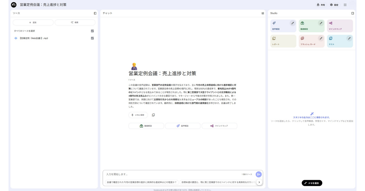 NotebookLMでは、会議終了後に音声やテキストを取り込んで議事録を生成します。リアルタイムでの記録には対応していないため、録音データをアップロードする形式が基本です。