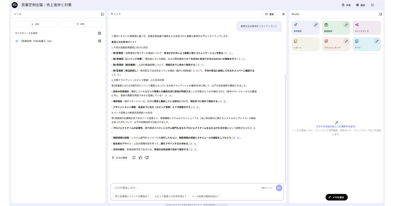 NotebookLMの大きな特徴のひとつが、「過去の会議データとの関連付け機能」です。これは、単に1回の会議内容を記録・要約するだけでなく、過去の議事録やノートを参照し、文脈を理解した上で新しい会議を整理できるという高度なAIアシスト機能です。