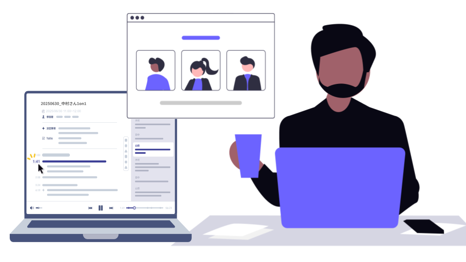 (『スマート書記』のおかげで、午後の面談もスムーズに進められそうだ。各メンバーとの会話内容に合わせて簡単なメモを取るだけで後でいつでも聞き直るし、AIアシスト機能で決定事項やTodoをまとめておけば、そこに工数をかけずに迅速にフィードバックできるな…)